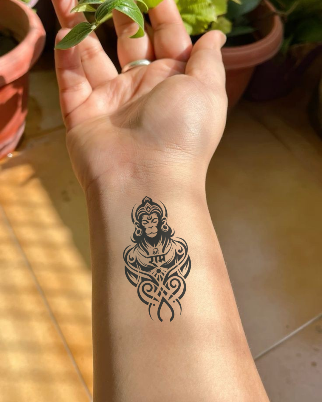 The Hanuman Semi-Permanent Tattoo symbolizes strength, devotion, and protection. As a revered deity in Hindu mythology, Hanuman represents courage, loyalty, and the triumph of good over evil. This tattoo is perfect for those who seek spiritual strength and resilience in their journey. Made with skin-friendly, plant-based ink, it lasts up to two weeks, offering a temporary yet powerful expression of faith and determination.